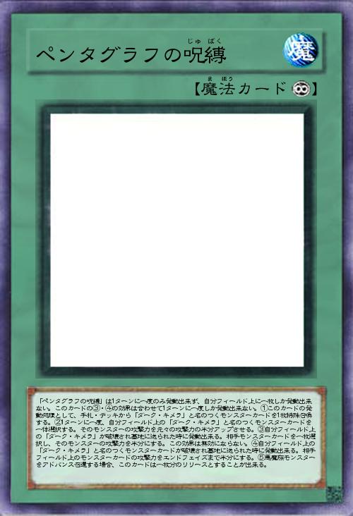 | 「ペンタグラフの呪縛」は1ターンに一度のみ発動出来ず、自分フィールド上に一枚しか発動出来ない。このカードの③・④の効果は合わせて1ターンに一度しか発動出来ない。①このカードの発動処理として、手札・デッキから「ダーク・キメラ」と名のつくモンスターカードを1枚特殊召喚する。②1ターンに一度、自分フィールド上の「ダーク・キメラ」と名のつくモンスターカードを一体選択する。そのモンスターの攻撃力を元々の攻撃力の半分アップさせる。③自分フィールド上の「ダーク・キメラ」が破壊され墓地に送られた時に発動出来る。相手モンスターカードを一枚選択し、そのモンスターの攻撃力を半分にする。この効果は無効にならない。④自分フィールド上の「ダーク・キメラ」と名のつくモンスターカードが破壊され墓地に送られた時に発動出来る。相手フィールド上のモンスターカードの攻撃力をエンドフェイズまで半分にする。⑤悪魔族モンスターをアドバ | |||