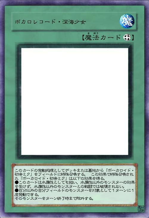| このカードの発動処理としてデッキまたは墓地から「ボーカロイド・初音ミク」をフィールドに特殊召喚する。 この効果で特殊召喚された「ボーカロイド・初音ミク」は以下の効果を得る。 ●このカードは水属性としても扱い、水属性以外のモンスターの効果を受けず、水属性以外のモンスターとの戦闘では破壊されない。 ●自分以外の自分フィールドのモンスターを対象として1ターンに1度発動できる。 そのモンスターをターン終了時まで除外する。 | |||