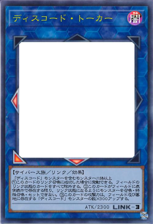 | 「ディスコード」モンスターを含むモンスター二体以上 ①このカードのリンク召喚に成功した場合に発動できる。フィールドのリンク状態のカードをすべて除外する。②このカードがフィールドに表側表示で存在する限り、リンク状態になるようにモンスターを召喚・特殊召喚・セットできない。③このカードの攻撃力は、フィールド及び墓地に存在する「ディスコード」モンスターの数×300アップする。 | |||