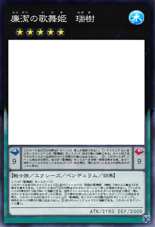 | レベル5「歌舞姫」モンスター×2 このカードは自分のメインフェイズ2に自分フィールドの「制服の歌舞姫 瑞樹」1体の上に重ねてX召喚する事もできる。このカード名の①③の効果はそれぞれ1ターンに1度しか使用できない。①:このカードのX素材を1つ取り除いて発動できる。相手フィールドのセットされたカードを2枚まで選び、選んだカードを元々の持ち主のデッキに戻す。②:X素材を持ったこのカードがモンスターゾーンに存在する限り、このカード以外の自分フィールド上の「歌舞姫」モンスターの攻撃力は400ポイントアップし、相手のカード効果の対象にはならない。③:自分のメインフェイズ2に発動できる。このカードをPゾーンに置く。 | |||