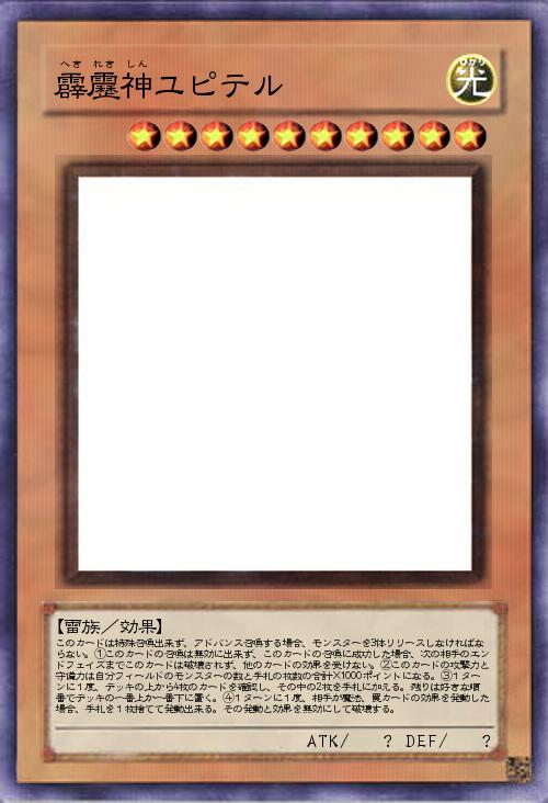 | このカードは特殊召喚出来ず、アドバンス召喚する場合、モンスターを3体リリースしなければならない。①このカードの召喚は無効に出来ず、このカードの召喚に成功した場合、次の相手のエンドフェイズまでこのカードは破壊されず、他のカードの効果を受けない。②このカードの攻撃力と守備力は自分フィールドのモンスターの数と手札の枚数の合計×1000ポイントになる。③1ターンに1度、デッキの上から4枚のカードを確認し、その中の2枚を手札に加える。残りは好きな順番でデッキの一番上か一番下に置く。④1ターンに1度、相手が魔法、罠カードの効果を発動した場合、手札を1枚捨てて発動出来る。その発動と効果を無効にして破壊する。 | |||