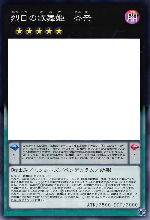 | レベル5「歌舞姫」モンスター×2 このカードは自分のメインフェイズ2に自分フィールドの「制服の歌舞姫 杏奈」1体の上に重ねてX召喚する事もできる。レベル5がP召喚可能な場合にエクストラデッキの表側表示のこのカードはP召喚できる。このカード名の①③の効果はそれぞれ1ターンに1度しか使用できない。①:X素材を1つ取り除いて発動できる。自分の墓地のカードを5枚まで選択し、選択したカードをデッキに戻しシャッフルする。その後自分はデッキから2枚ドローする。②:X素材を持ったこのカードがフィールドに存在する限り、このカード以外の自分フィールドの「歌舞姫」モンスターが守備表示モンスターと戦闘を行った場合、その守備力を攻撃力が超えた分だけ戦闘ダメージを与える。 ③:自分のメインフェイズに発動できる。このカードをPゾーンに置く。 | |||