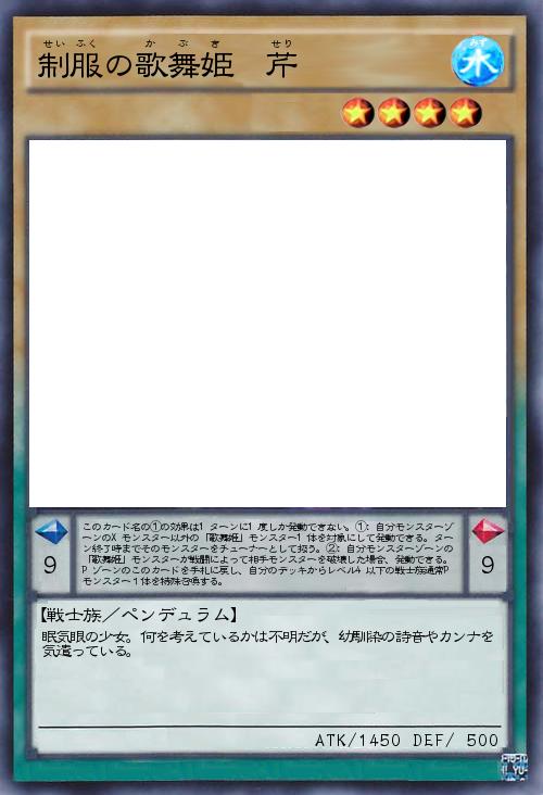 | このカード名の①の効果は1ターンに1度しか発動できない。①:自分モンスターゾーンのXモンスター以外の「歌舞姫」モンスター1体を対象にして発動できる。ターン終了時までそのモンスターをチューナーとして扱う。②:自分モンスターゾーンの「歌舞姫」モンスターが戦闘によって相手モンスターを破壊した場合、発動できる。Pゾーンのこのカードを手札に戻し、自分のデッキからレベル4以下の戦士族通常Pモンスター1体を特殊召喚する。 | |||