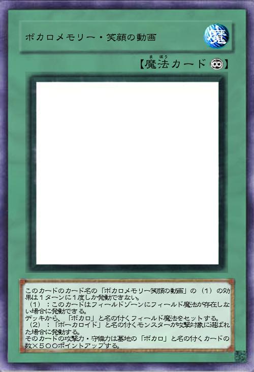 | このカードのカード名の「ボカロメモリー笑顔の動画」の(1)の効果は1ターンに1度しか発動できない。 (1):このカードはフィールドゾーンにフィールド魔法が存在しない場合に発動できる。 デッキから、「ボカロ」と名の付くフィールド魔法をセットする。 (2):「ボーカロイド」と名の付くモンスターが攻撃対象に選ばれた場合に発動する。 そのカードの攻撃力・守備力は墓地の「ボカロ」と名の付くカードの数×500ポイントアップする。 | |||