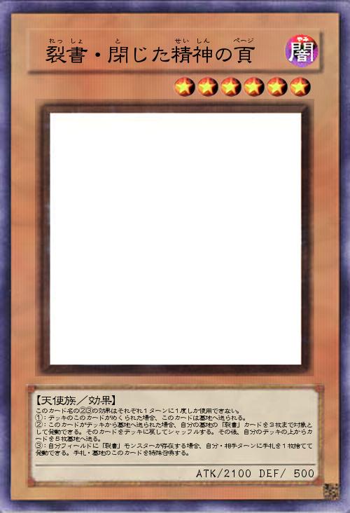 | このカード名の②③の効果はそれぞれ1ターンに1度しか使用できない。 ①:デッキのこのカードがめくられた場合、このカードは墓地へ送られる。 ②:このカードがデッキから墓地へ送られた場合、自分の墓地の「裂書」カードを3枚まで対象として発動できる。そのカードをデッキに戻してシャッフルする。その後、自分のデッキの上からカードを5枚墓地へ送る。 ③:自分フィールドに「裂書」モンスターが存在する場合、自分・相手ターンに手札を1枚捨てて発動できる。手札・墓地のこのカードを特殊召喚する。 | |||
