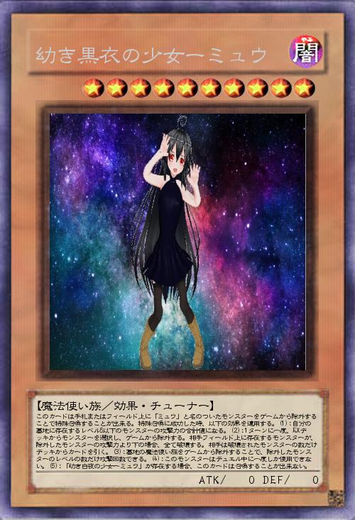 | このカードは手札またはフィールド上に「ミュウ」と名のついたモンスターをゲームから除外することで特殊召喚することが出来る。特殊召喚に成功した時、以下の効果を適用する。(1):自分の墓地に存在するレベル5以下のモンスターの攻撃力の合計値になる。(2):1ターンに一度、EXデッキからモンスターを選択し、ゲームから除外する。相手フィールド上に存在するモンスターが、除外したモンスターの攻撃力より下の場合、全て破壊する。相手は破壊されたモンスターの数だけデッキからカードを引く。(3):墓地の魔法使い族をゲームから除外することで、除外したモンスターのレベルの数だけ攻撃回数できる。(4):このモンスターはデュエル中に一度しか使用できない。(5):「幼き白夜の少女ーミュウ」が存在する場合、このカードは召喚することが出来ない。 | |||