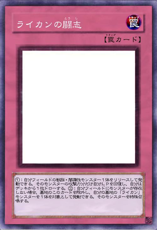 | ①:自分フィールドの獣族・闇属性モンスター1体をリリースして発動できる。そのモンスターの攻撃力分だけ自分LPを回復し、自分はデッキから1枚ドローする。②:自分フィールドにモンスターが存在しない場合、墓地のこのカードを除外し、自分の墓地の「ライカン」モンスターを1体を対象として発動できる。そのモンスターを特殊召喚する。 | |||