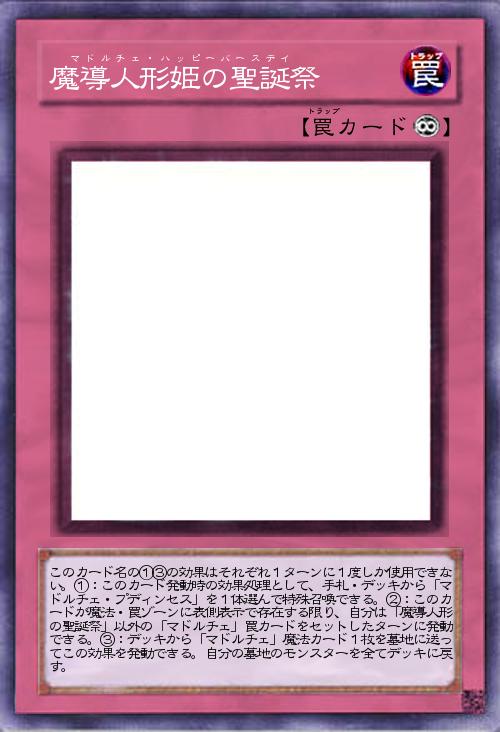 | このカード名の①③の効果はそれぞれ1ターンに1度しか使用できない。①:このカード発動時の効果処理として、手札・デッキから「マドルチェ・プディンセス」を1体選んで特殊召喚できる。②:このカードが魔法・罠ゾーンに表側表示で存在する限り、自分は「魔導人形の聖誕祭」以外の「マドルチェ」罠カードをセットしたターンに発動できる。③:デッキから「マドルチェ」魔法カード1枚を墓地に送ってこの効果を発動できる。自分の墓地のモンスターを全てデッキに戻す。 | |||