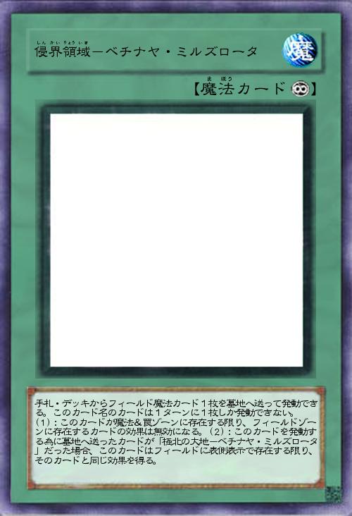 | 手札・デッキからフィールド魔法カード1枚を墓地へ送って発動できる。このカード名のカードは1ターンに1枚しか発動できない。 (1):このカードが魔法&罠ゾーンに存在する限り、フィールドゾーンに存在するカードの効果は無効になる。(2):このカードを発動する為に墓地へ送ったカードが「極北の大地-ベチナヤ・ミルズロータ」だった場合、このカードはフィールドに表側表示で存在する限り、そのカードと同じ効果を得る。 | |||