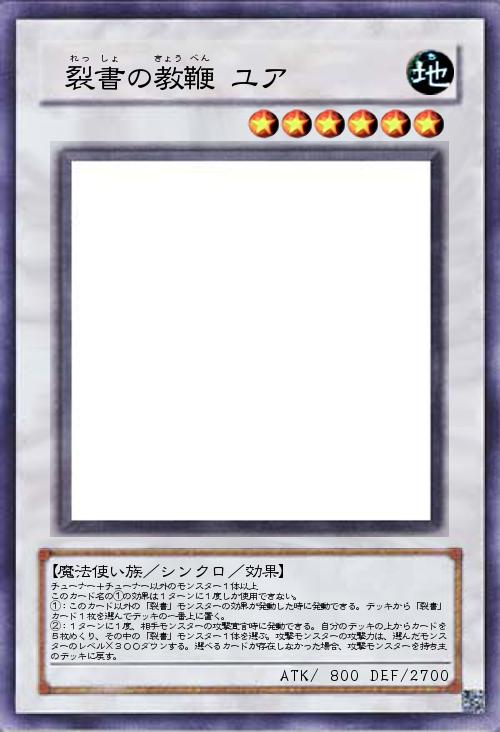 | チューナー+チューナー以外のモンスター1体以上 このカード名の①の効果は1ターンに1度しか使用できない。 ①:このカード以外の「裂書」モンスターの効果が発動した時に発動できる。デッキから「裂書」カード1枚を選んでデッキの一番上に置く。 ②:1ターンに1度、相手モンスターの攻撃宣言時に発動できる。自分のデッキの上からカードを5枚めくり、その中の「裂書」モンスター1体を選ぶ。攻撃モンスターの攻撃力は、選んだモンスターのレベル×300ダウンする。選べるカードが存在しなかった場合、攻撃モンスターを持ち主のデッキに戻す。 | |||