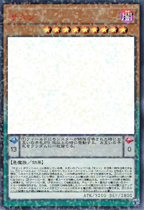 | 「サタン」がフィールド上に存在している時、お互いのプレイヤーは「サタン」を召喚・特殊召喚できない。①フィールド上に「アルル」と名のつくモンスターカードもしくは「カーバンクル」が存在している場合、このカードを手札から特殊召喚出来る。この効果は相手ターン中でも使用できる。②このカードが自分フィールド上に存在している場合、自分フィールド上の魔法使い族とこのカードは相手の効果の対象にならない。③1ターンに一度、魔法・罠カードが発動した時に発動出来る。そのカードの効果を無効にし破壊する。④1ターンに一度、LPを半分にして発動出来る。手札・デッキ・墓地から魔法使い族カードを一体特殊召喚する。その後、この効果で特殊召喚したカードの攻撃力分このカードの攻撃力をアップさせ、このカードはエンドフェイズまでフィールドに存在する魔法使い族の数だけ攻撃できる。⑤このカードが破壊された時に発動出来る。カードを一枚ドロ | |||