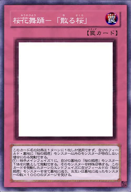 | このカード名の効果は1ターンに1枚しか使用できず、自分のフィールド・墓地に「桜の姫君」モンスター以外のモンスターが存在しない場合にのみ発動できる。 ①:相手メインフェイズ1に、自分の墓地の「桜の姫君」モンスター1体を対象として発動できる。そのモンスターを特殊召喚する。このカードを発動したターンのエンドフェイズに自分フィールドの「桜の姫君」モンスターを全て墓地に送り、お互いは墓地に送ったモンスターの数×1000のダメージを受ける。 | |||