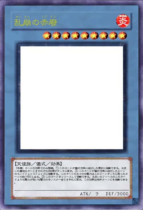 | 「赤廢」カードの効果でのみ降臨。①:このカードが儀式召喚に成功した場合に発動できる。お互いの墓地のカードをそれぞれ3枚選びデッキに戻す。②:このカードが儀式召喚に成功したターンのエンドフェイズフェイズに発動する。このカードの元々の攻撃力はこのターンデッキに戻ったカードの数×600となる。③:このカードをリリースして発動できる。お互いのフィールのこのカードより攻撃力が低い攻撃力のモンスター全てを手札に戻す。この効果は相手ターンにも発動できる。 | |||