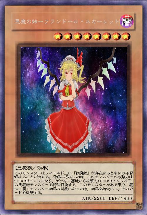 | このモンスターはフィールド上に「紅魔館」が存在するときにのみ召喚することが出来る。召喚に成功した時、このモンスターの攻撃力は3000ポイントになり、デッキ・墓地から攻撃力1000ポイント以下の悪魔族モンスターを特殊召喚する。このモンスターがある限り、魔法・罠・モンスター効果の対象になった時、効果を無効にし、そのカードを破壊する。 | |||