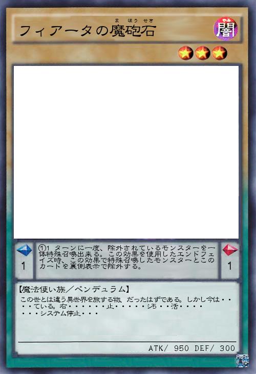 | ①1ターンに一度、除外されているモンスターを一体特殊召喚出来る。この効果を使用したエンドフェイズ時、この効果で特殊召喚したモンスターとこのカードを裏側表示で除外する。 | |||