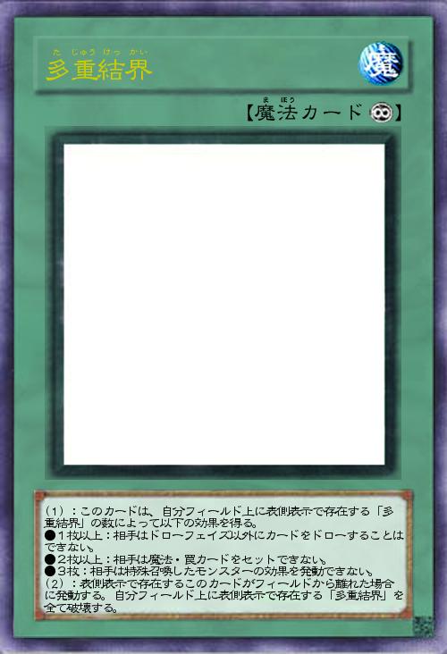 | (1):このカードは、自分フィールド上に表側表示で存在する「多重結界」の数によって以下の効果を得る。 ●1枚以上:相手はドローフェイズ以外にカードをドローすることはできない。 ●2枚以上:相手は魔法・罠カードをセットできない。 ●3枚:相手は特殊召喚したモンスターの効果を発動できない。 (2):表側表示で存在するこのカードがフィールドから離れた場合に発動する。自分フィールド上に表側表示で存在する「多重結界」を全て破壊する。 | |||