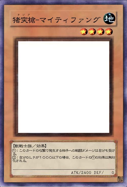 | ①:このカードの攻撃で発生する相手への戦闘ダメージは自分も受ける。 ②:自分のLPが1000以下の場合、このカードの①の効果は無効化される。 | |||