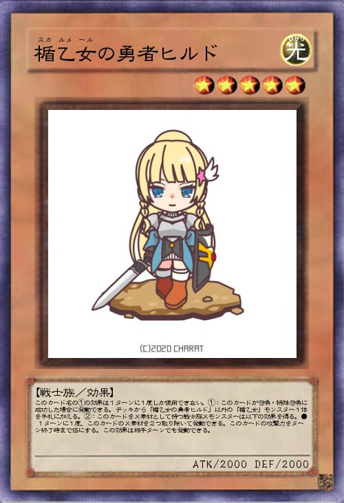| このカード名の①の効果は1ターンに1度しか使用できない。①:このカードが召喚・特殊召喚に成功した場合に発動できる。デッキから「楯乙女の勇者ヒルド」以外の「楯乙女」モンスター1体を手札に加える。②:このカードをX素材として持つ戦士族Xモンスターは以下の効果を得る。● 1ターンに1度、このカードのX素材を2つ取り除いて発動できる。このカードの攻撃力をターン終了時まで倍にする。この効果は相手ターンでも発動できる。 | |||