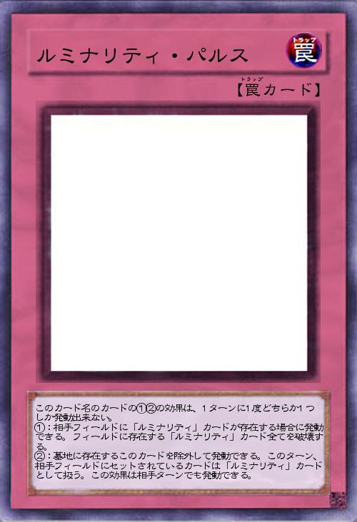 | このカード名のカードの①②の効果は、1ターンに1度どちらか1つしか発動出来ない。 ①:相手フィールドに「ルミナリティ」カードが存在する場合に発動できる。フィールドに存在する「ルミナリティ」カード全てを破壊する。 ②:墓地に存在するこのカードを除外して発動できる。このターン、相手フィールドにセットされているカードは「ルミナリティ」カードとして扱う。この効果は相手ターンでも発動できる。 | |||