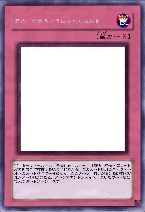 | ①:自分フィールドに「忍者」モンスター、「忍法」魔法・罠カードが表側表示で存在する場合発動できる。このカード以外の自分フィールドのカードを全て手札に戻す。このターン、自分が受ける戦闘・効果ダメージは0になる。ターンのエンドフェイズに戻したカードを全て元のカードゾーンに戻す。 | |||