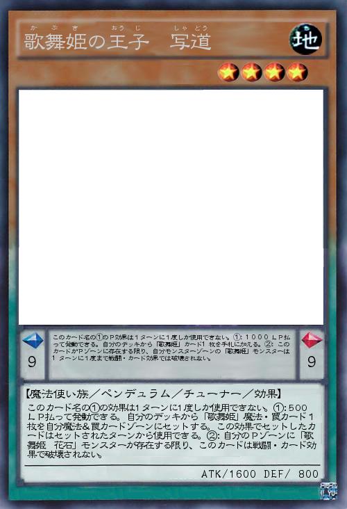 | このカード名の①のP効果は1ターンに1度しか使用できない。①:1000LP払って発動できる。自分のデッキから「歌舞姫」カード1枚を手札に加える。②:このカードがPゾーンに存在する限り、自分モンスターゾーンの「歌舞姫」モンスターは1ターンに1度まで戦闘・カード効果では破壊されない。 | |||