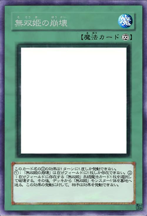 | このカード名の②の効果は1ターンに1度しか発動できない。 ①:「無双姫の崩壊」は自分フィールドに1枚しか存在できない。②:自分フィールドに存在する「無双姫」永続魔法カード1枚を選択して破壊する。その後、デッキから「無双姫」モンスター1体を墓地へ送る。この効果の発動に対して、相手は効果を発動できない。 | |||