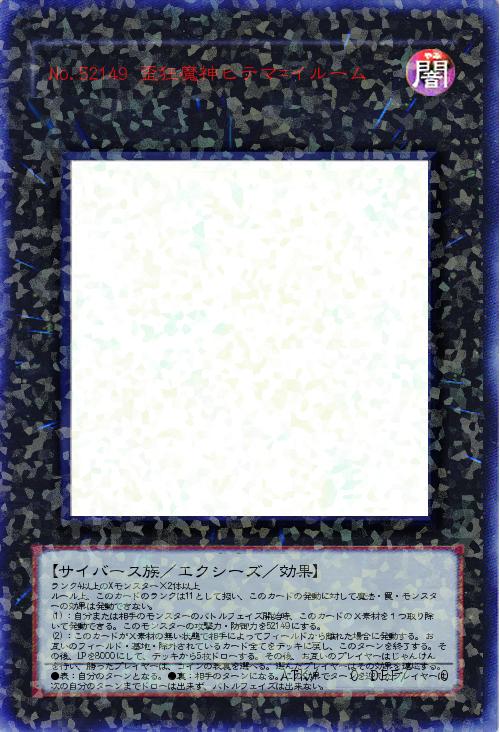 | ランク4以上のXモンスター×2体以上 ルール上、このカードのランクは11として扱い、このカードの発動に対して魔法・罠・モンスターの効果は発動できない。 (1):自分または相手のモンスターのバトルフェイズ開始時、このカードのX素材を1つ取り除いて発動できる。このモンスターの攻撃力・防御力を52149にする。 (2):このカードがX素材の無い状態で相手によってフィールドから離れた場合に発動する。お互いのフィールド・墓地・除外されているカード全てをデッキに戻し、このターンを終了する。その後、LPを8000にして、デッキから5枚ドローする。その後、お互いのプレイヤーはじゃんけんを行い、勝ったプレイヤーは、コインの表裏を選べる。選んだプレイヤーはその効果を適応する。 ●表:自分のターンとなる。●裏:相手のターンになる。この効果でターンを迎えたプレイヤーは次の自分のターンまでドローは出来ず、バトルフェ | |||