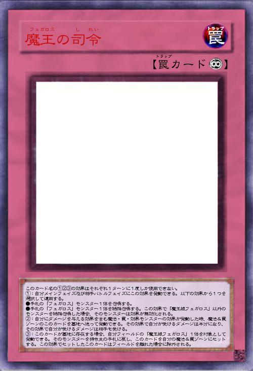 | このカード名の①②③の効果はそれぞれ1ターンに1度しか使用できない。 ①:自分メインフェイズ及び相手バトルフェイズにこの効果を発動できる。以下の効果から1つを選択して適用する。 ●手札の「フェガロス」モンスター1体を召喚する。 ●手札の「フェガロス」モンスター1体を特殊召喚する。この効果で「魔王娘フェガロス」以外のモンスターを特殊召喚した場合、そのモンスターは効果が無効化される。 ②:自分にダメージを与える効果を含む魔法・罠・効果モンスターの効果が発動した時、魔法&罠ゾーンのこのカードを墓地へ送って発動できる。その効果で自分が受けるダメージは半分になり、その効果で自分が受けるダメージは相手も受ける。 ③:このカードが墓地に存在する場合、自分フィールドの「魔王娘フェガロス」1体を対象として発動できる。そのモンスターを持ち主の手札に戻し、このカードを自分の魔法&罠ゾーンにセットする。この効果で | |||
