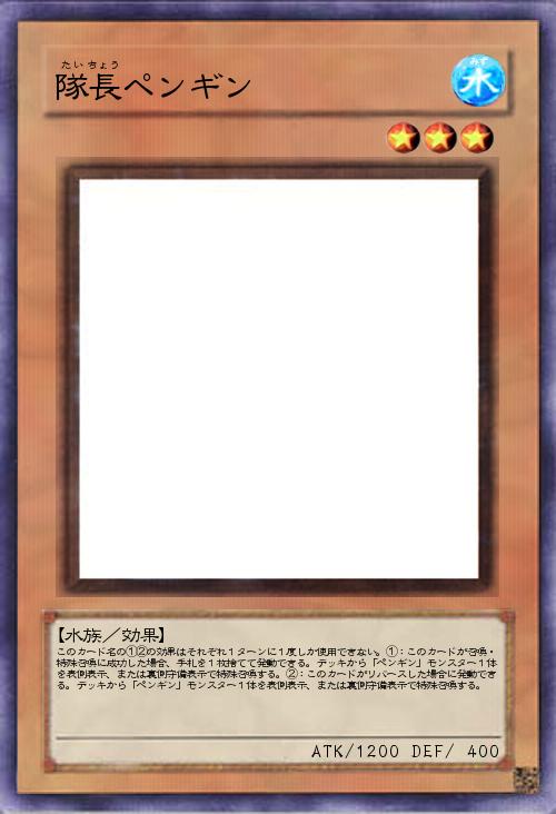 | このカード名の①②の効果はそれぞれ1ターンに1度しか使用できない。①:このカードが召喚・特殊召喚に成功した場合、手札を1枚捨てて発動できる。デッキから「ペンギン」モンスター1体を表側表示、または裏側守備表示で特殊召喚する。②:このカードがリバースした場合に発動できる。デッキから「ペンギン」モンスター1体を表側表示、または裏側守備表示で特殊召喚する。 | |||