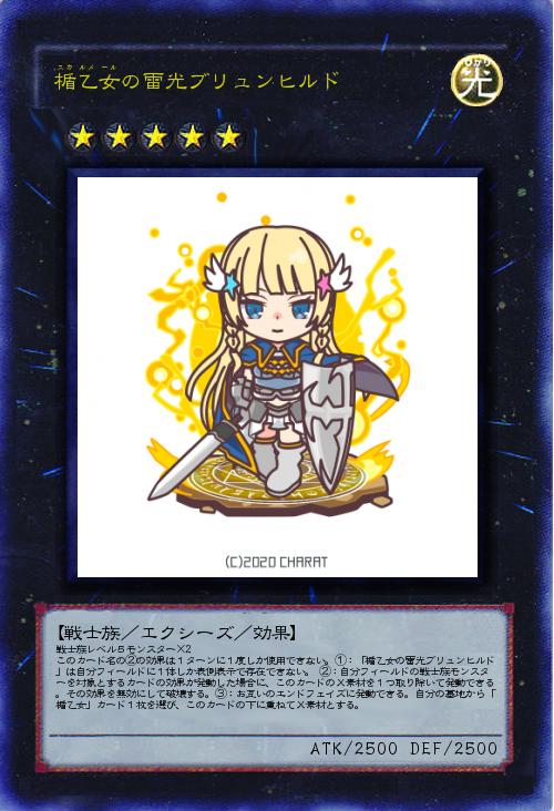 | 戦士族レベル5モンスター×2 このカード名の②の効果は1ターンに1度しか使用できない。①:「楯乙女の雷光ブリュンヒルド」は自分フィールドに1体しか表側表示で存在できない。 ②:自分フィールドの戦士族モンスターを対象とするカードの効果が発動した場合に、このカードのX素材を1つ取り除いて発動できる。その効果を無効にして破壊する。③:お互いのエンドフェイズに発動できる。自分の墓地から「楯乙女」カード1枚を選び、このカードの下に重ねてX素材とする。 | |||