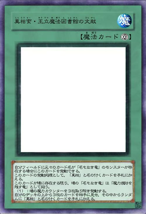 | 自分フィールドに元々のカード名が「名もなき竜」のモンスターが存在する場合にこのカードを発動できる。 このカードの発動処理として、「真相」と名の付くカードを手札に加える。 このカードが場に存在する限り、場の「名もなき竜」は「魔力痕跡を残す竜」として扱う。 (1):場の魔力カウンターを3枚取り除き発動する。 自分のデッキの上から3枚のカードを相手に見せ、その中からランダムに「真相」と名の付くカードを手札に加える。 | |||