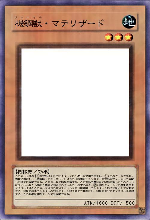 | このカード名の①②の効果はそれぞれ1ターンに1度しか使用できない。①:このカードが手札・墓地に存在し、「機鋼獣・マテリザード」以外の「機鋼獣」モンスターの効果がフィールドで発動した場合に発動できる。このカードを特殊召喚する。この効果で墓地から特殊召喚したこのカードはフィールドから離れた場合に持ち主のデッキの一番下に戻る。②:相手フィールドの表側表示モンスター1体とこのカード以外の自分フィールドの「機鋼獣」モンスター1体を対象として発動できる。対象の相手モンスターの効果をターン終了時まで無効にし、対象の自分のモンスターを破壊する。この効果は相手ターンでも発動できる。 | |||