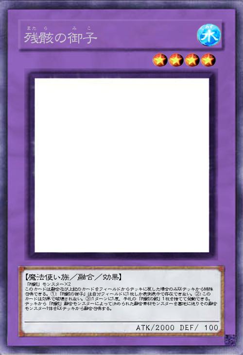 | 「残骸」モンスター×2 このカードは融合及び上記のカードをフィールドからデッキに戻した場合のみEXデッキから特殊召喚できる。①:「残骸の御子」は自分フィールドに1枚しか表側表示で存在できない。②:このカードは効果で破壊されない。③:1ターンに1度、手札の「残骸の骸」1枚を捨てて発動できる。デッキから「残骸」融合モンスターによって決められた融合素材モンスターを墓地に送りその融合モンスター1体をEXデッキから融合召喚する。 | |||