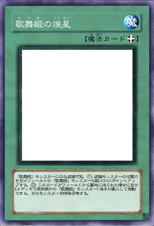 | 「歌舞姫」モンスターにのみ装備可能。①:装備モンスターの攻撃力を自分フィールドの「歌舞姫」モンスターの数×300ポイントアップする。②:このカードがフィールドから墓地に送られた場合に自分EXデッキで表側表示の「歌舞姫」モンスター1体を対象にして発動できる。そのモンスターを特殊召喚する。 | |||