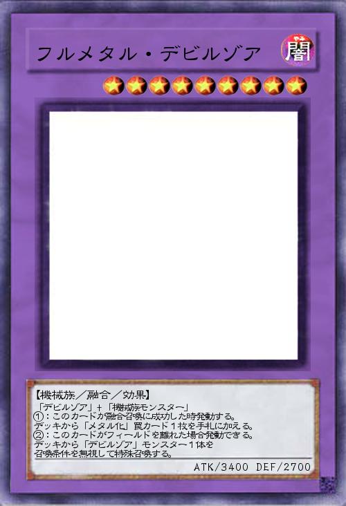 | 「デビルゾア」+「機械族モンスター」 ①:このカードが融合召喚に成功した時発動する。 デッキから「メタル化」罠カード1枚を手札に加える。 ②:このカードがフィールドを離れた場合発動できる。 デッキから「デビルゾア」モンスター1体を 召喚条件を無視して特殊召喚する。 | |||