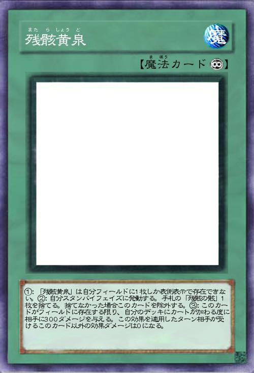 | ①:「残骸黄泉」は自分フィールドに1枚しか表側表示で存在できない。②:自分スタンバイフェイズに発動する。手札の「残骸の骸」1枚を捨てる。捨てなかった場合このカードを除外する。③:このカードがフィールドに存在する限り、自分のデッキにカートが加わる度に相手に300ダメージを与える。この効果を適用したターン相手が受けるこのカード以外の効果ダメージは0になる。 | |||
