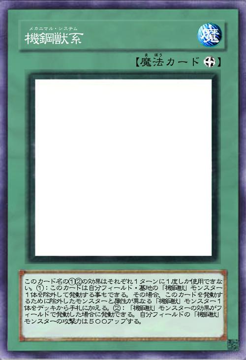 | このカード名の①②の効果はそれぞれ1ターンに1度しか使用できない。①:このカードは自分フィールド・墓地の「機鋼獣」モンスター1体を除外して発動する事もできる。その場合、このカードを発動するために除外したモンスターと属性が異なる「機鋼獣」モンスター1体をデッキから手札に加える。②:「機鋼獣」モンスターの効果がフィールドで発動した場合に発動できる。自分フィールドの「機鋼獣」モンスターの攻撃力は500アップする。 | |||