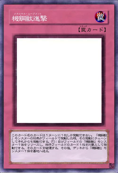| このカード名のカードは1ターンに1枚しか発動できない。「機鋼獣」モンスターの効果がフィールドで発動した時、その発動にチェーンして手札からも発動できる。①:自分フィールドの「機鋼獣」モンスター1体をリリースし、相手フィールドのカード1枚を対象として発動できる。そのカードを破壊する。その後、デッキから「機鋼獣」モンスター1体を墓地へ送る。 | |||
