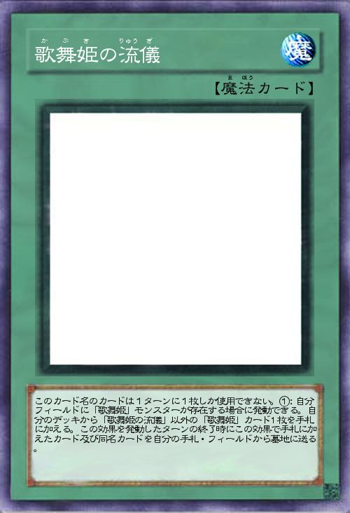 | このカード名のカードは1ターンに1枚しか使用できない。①:自分フィールドに「歌舞姫」モンスターが存在する場合に発動できる。自分のデッキから「歌舞姫の流儀」以外の「歌舞姫」カード1枚を手札に加える。この効果を発動したターンの終了時にこの効果で手札に加えたカード及び同名カードを自分の手札・フィールドから墓地に送る。 | |||