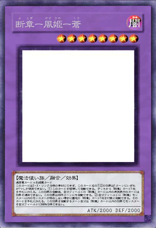 | 通常罠カード+永続罠カード このカードはS・X・リンク召喚の素材にできず、このカード名の①②の効果は1ターンにいずれか1つしか使用できない。①:このカードを破壊して発動できる。デッキから「断章」カード1枚を手札に加える。この効果の発動後、自分フィールドの「断章」カード以外の表側表示のカードは効果を適用できない。この効果は相手ターンにも発動できる。②:自分フィールドに「断章」モンスター以外のモンスターが存在しない場合に墓地の「断章」カード1枚を対象に発動できる。そのカードを手札に加える。この効果を発動するターン自分は「断章」カード以外の効果でモンスターを自分フィールドに特殊召喚できない。 | |||