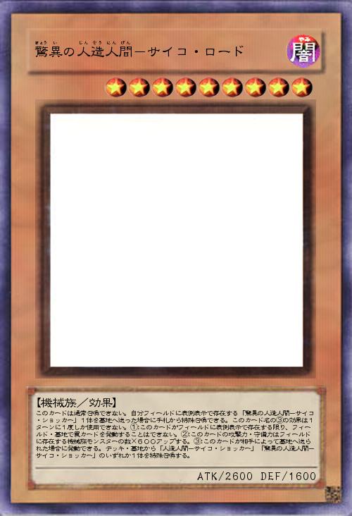 「冥闇のデュエリスト編でサイコ・ショッカー関連の新規が出るので作ってみました。特殊召喚のコストに驚異の人造人間を要求し、フィールド・墓地での罠の発動を封じ、フィールドの機械族の数に応じた自己強化、相手によって墓地へ送られるとサイコ・ショッカー2種類のうちのいずれかを特殊召喚できます。」(2020-05-02 01:50)