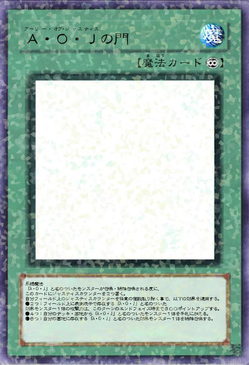 永続魔法 「A・O・J」と名のついたモンスターが召喚・特殊召喚される度に、 このカードにジャスティスカウンターを2つ置く。 自分フィールド上のジャスティスカウンターを任意の個数取り除く事で、以下の効果を適用する。 ●2つ:フィールド上に表側表示で存在する「A・O・J」と名のついた 効果モンスター1体の攻撃力は、このターンのエンドフェイズ時まで500ポイントアップする。 ●4つ:自分のデッキ・墓地から「A・O・J」と名のついたモンスター1体を手札に加える。 ●6つ:自分の墓地に存在する「A・O・J」と名のついた効果モンスター1体を特殊召喚する。 |