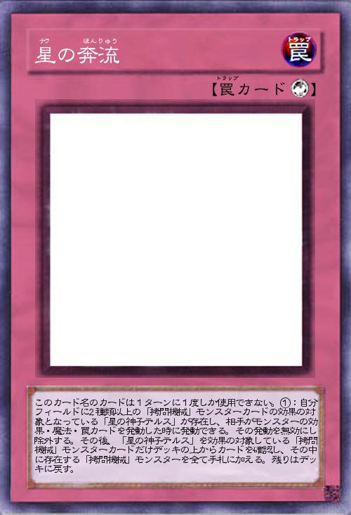 | このカード名のカードは1ターンに1度しか使用できない。①:自分フィールドに2種類以上の「拷問機械」モンスターカードの効果の対象となっている「星の神子テルス」が存在し、相手がモンスターの効果・魔法・罠カードを発動した時に発動できる。その発動を無効にし除外する。その後、「星の神子テルス」を効果の対象している「拷問機械」モンスターカードだけデッキの上からカードを確認し、その中に存在する「拷問機械」モンスターを全て手札に加える。残りはデッキに戻す。 | |||