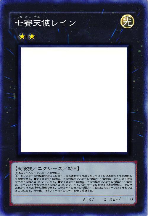 | 天使族レベル2モンスター×2体以上 ①:モンスターの攻撃宣言時にこのカードのX素材を1つ取り除いて以下の効果から1つを選択して発動できる。●サイコロを1回振る。その攻撃モンスターの攻撃力・守備力は、ターン終了時まで出た目の数×200アップする。●サイコロを1回振る。その攻撃モンスターの攻撃力・守備力は、ターン終了時まで出た目の数×200ダウンする。②:サイコロを振る効果が発動し、その出た目が7だった場合に発動できる。このカードの元々の攻撃力・守備力は次のターン終了時まで2800になる。その後、相手フィールドのカードを全て破壊する。 | |||