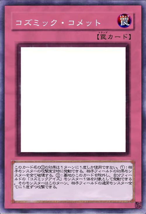 | このカード名の②の効果は1ターンに1度しか使用できない。①:相手モンスターの攻撃宣言時に発動できる。相手フィールドの効果モンスターを全て破壊する。②:墓地のこのカードを除外し、自分フィールドの「コズミックアイズ」モンスター1体を対象として発動できる。そのモンスターはこのターン、相手フィールドの通常モンスター全てに1度ずつ攻撃できる。 | |||