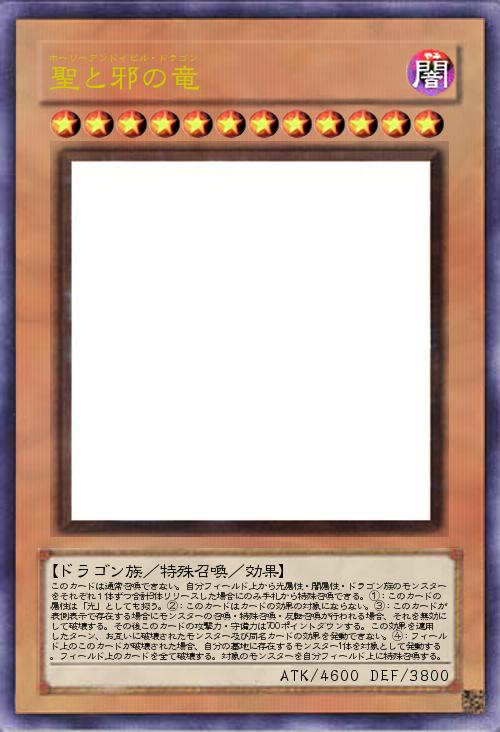 | このカードは通常召喚できない。自分フィールド上から光属性・闇属性・ドラゴン族のモンスターをそれぞれ1体ずつ合計3体リリースした場合にのみ手札から特殊召喚できる。①:このカードの属性は「光」としても扱う。②:このカードはカードの効果の対象にならない。③:このカードが表側表示で存在する場合にモンスターの召喚・特殊召喚・反転召喚が行われる場合、それを無効にして破壊する。その後このカードの攻撃力・守備力は700ポイントダウンする。この効果を適用したターン、お互いに破壊されたモンスター及び同名カードの効果を発動できない。④:フィールド上のこのカードが破壊された場合、自分の墓地に存在するモンスター1体を対象として発動する。フィールド上のカードを全て破壊する。対象のモンスターを自分フィールド上に特殊召喚する。 | |||