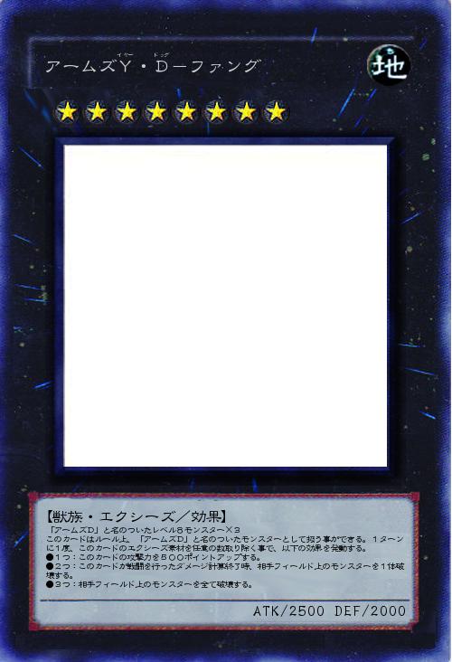 「アームズD」と名のついたレベル8モンスター×3 このカードはルール上、「アームズD」と名のついたモンスターとして扱う事ができる。1ターンに1度、このカードのエクシーズ素材を任意の数取り除く事で、以下の効果を発動する。 ●1つ:このカードの攻撃力を500ポイントアップする。 ●2つ:このカードが戦闘を行ったダメージ計算終了時、相手フィールド上のモンスターを1体破壊する。 ●3つ:相手フィールド上のモンスターを全て破壊する。 |
