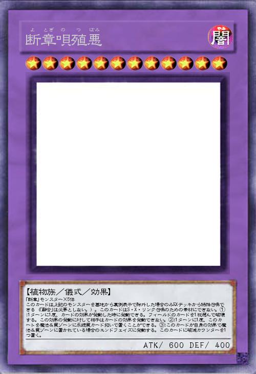 | 「断章」モンスター×5体 このカードは上記のモンスターを墓地から裏側表示で除外した場合のみEXデッキから特殊召喚できる(「融合」は必要としない。)。このカードはS・X・リンク召喚のための素材にできない。①:1ターンに1度、カードの効果が発動した時に発動できる。フィールドのカードを1枚選んで破壊する。この効果の発動に対して相手はカードの効果を発動できない。②:1ターンに1度、このカートを魔法&罠ゾーンに永続罠カード扱いで置くことができる。③:このカードが自身の効果で魔法&罠ゾーンに置かれている場合のエンドフェイズに発動する。このカードに破滅カウンターを1つ置く。 | |||