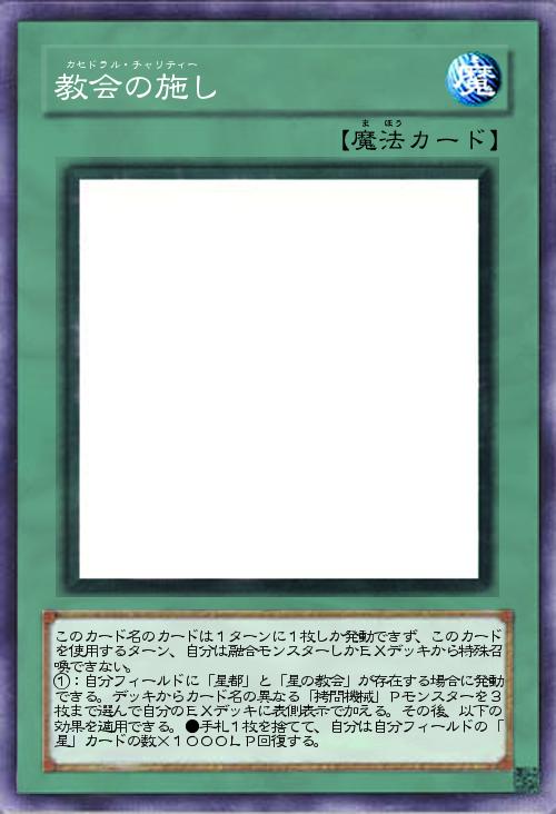 | このカード名のカードは1ターンに1枚しか発動できず、このカードを使用するターン、自分は融合モンスターしかEXデッキから特殊召喚できない。 ①:自分フィールドに「星都」と「星の教会」が存在する場合に発動できる。デッキからカード名の異なる「拷問機械」Pモンスターを3枚まで選んで自分のEXデッキに表側表示で加える。その後、以下の効果を適用できる。●手札1枚を捨てて、自分は自分フィールドの「星」カードの数×1000LP回復する。 | |||