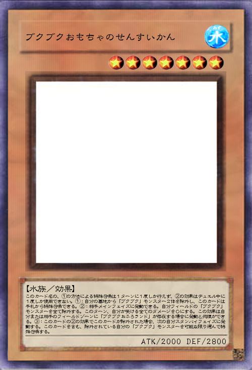 | このカード名の、①の方法による特殊召喚は1ターンに1度しか行えず、②の効果はデュエル中に1度しか使用できない。①:自分の墓地から「ブクブク」モンスター2体を除外し、このカードは手札から特殊召喚できる。②:相手メインフェイズに発動できる。自分フィールドの「ブクブク」モンスターを全て除外する。このターン、自分が受ける全てのダメージを0にする。この効果は自分または相手のフィールドゾーンに「ブクブクおふろランド」が存在する場合に発動と処理ができる。③:このカードの②の効果でこのカードが除外された場合、次の自分スタンバイフェイズに発動する。このカードを含む、除外されている自分の「ブクブク」モンスターを可能な限り選んで特殊召喚する。 | |||